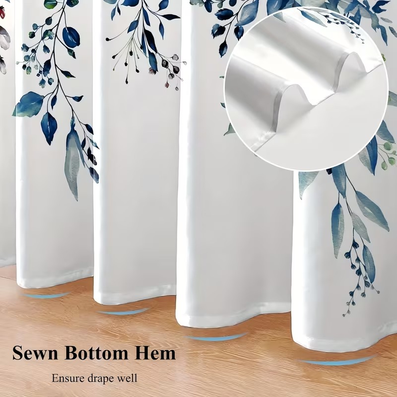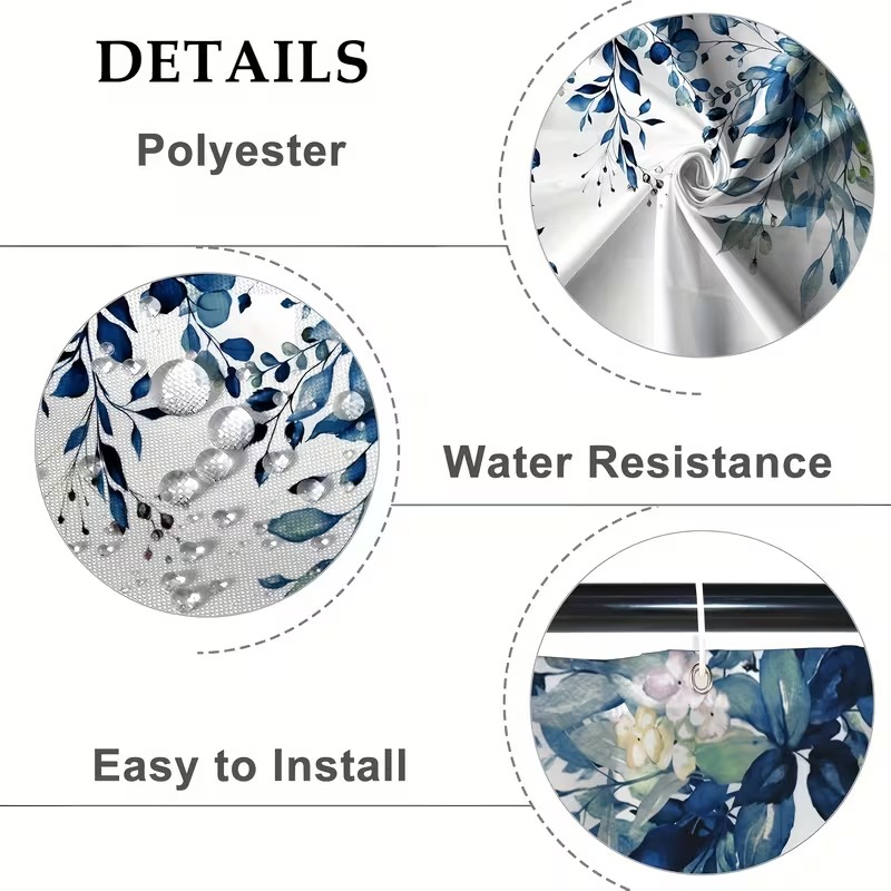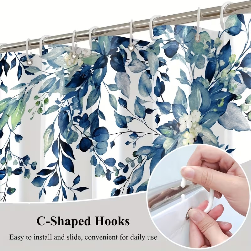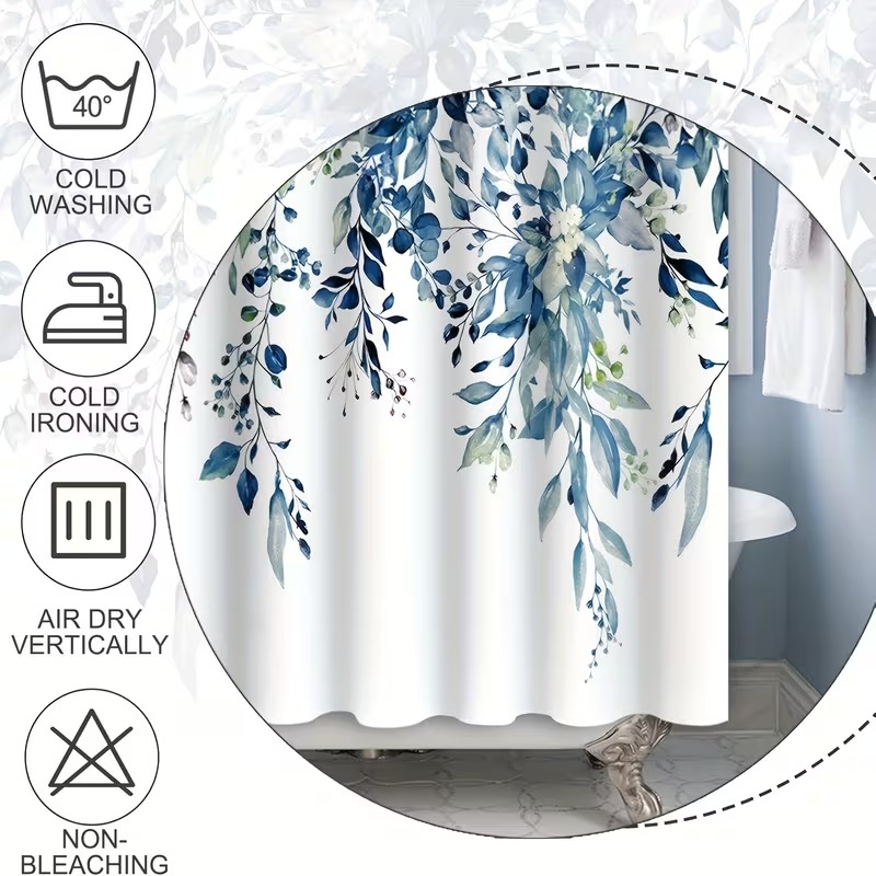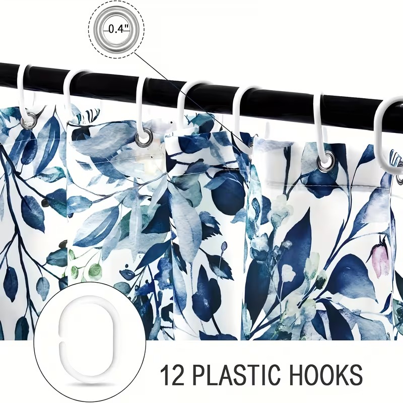 Cortina de ducha azul de eucalipto, hojas de plantas de acuarela con cortina de ducha de baño floral con ganchos, 72×72
