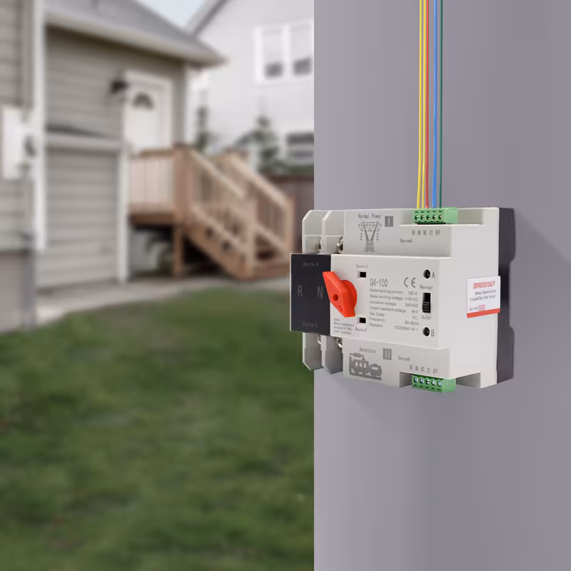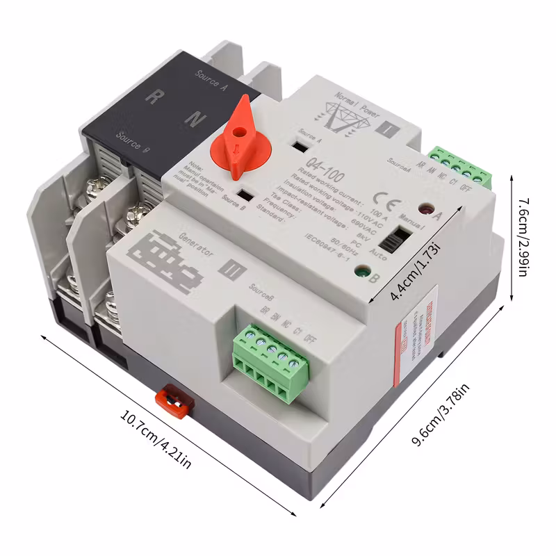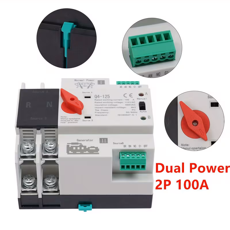 Interruptor de Transferencia Automática de Alta Resistencia 2 Polos 100A con Cambio Rápido de Fuente de Energía (<50ms), Interruptor Manual y Carcasa Aislante para Generador, Uso Comercial (110V/220V, Compatible)
